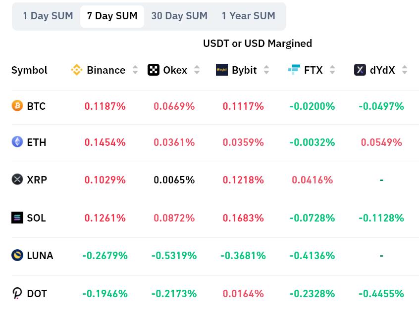 请注意所有前四名代币的累积 7 天资金费率如何翻转为正。该数据表明多头(买家)的需求略高,但还不显着。例如,比特币每周 0.10% 的正利率等于每月