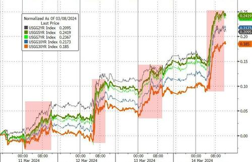 行情数据显示,各期限美债收益率隔夜不仅连续第四个交易日走高,而且涨幅明显扩大。其中,素有“全球资产定价之锚”的10年期美债收益率创下了2月中旬以来的最大单日涨幅,收益率也直逼向年内高位。