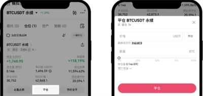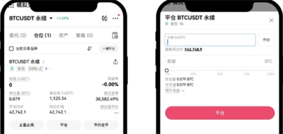 04 挂单成交后,可在持仓界面中可查看订单的相关数据,例如保证金、收益、收益率、预估强平价等。 05 您可在持仓界面设置止盈止损,还可选择平仓,输入平仓价格和平仓数量确定平仓,或选择市价全平完成平仓操作。