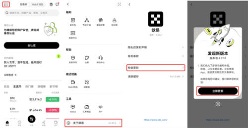 欧亿okx交易所是全球排名第一的数字货币交易平台,为用户提供全球热门金融数字资产交易投资服务,平台24小时行情实时刷新,用户轻松购买BTC、ETH、DOGE等数字资产,2024.4.2欧亿官网目前已经更新到最新版本v6.62.1,按照以下步骤即可更新,有需要的用户可以点击下载。