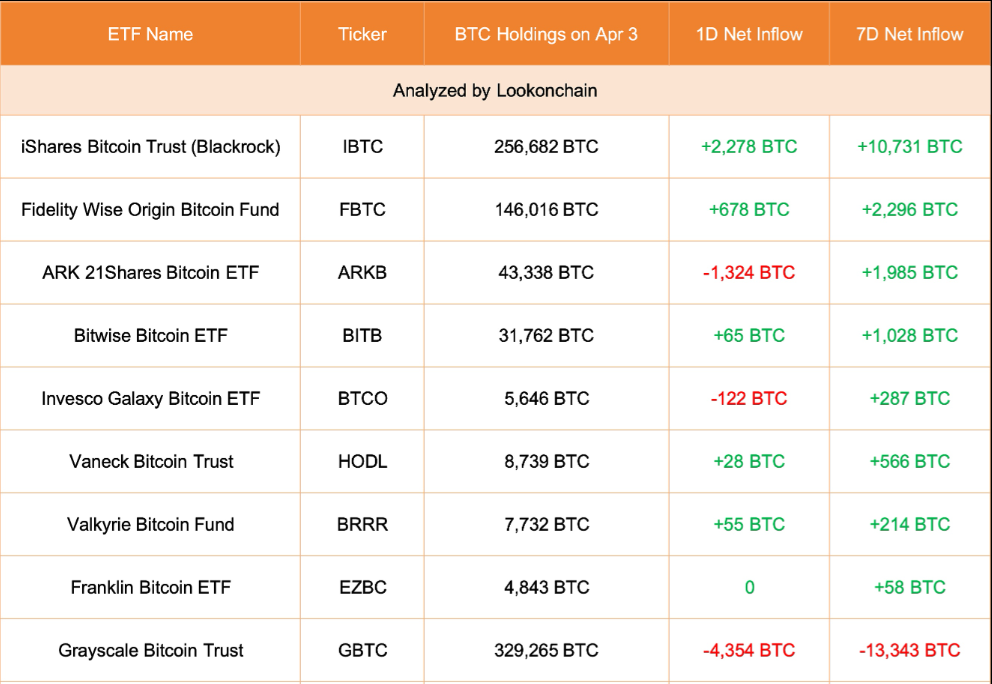 4月4日财经报道,据Lookonchain数据,4月3日9支比特币现货ETF(包括灰度)净减持2,695枚BTC,净流出约1.779亿美元。其中灰度减持了4,354枚BTC,净流出约2.874亿美元,目前持有329,265枚BTC,约合217.3亿美元。21Shares减持了1,324枚BTC,净流出约8740万美元,目前持有43,338枚BTC,约合28.6亿美元。