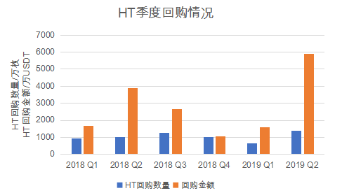 火币在2019年第二季度共回购1401.17万个HT,环比2019Q1的647.48万个增加753.69万个,回购数量环比增长116.4%,创历史新高;同比2018Q2回购的1001.73万个增加399.44万个,同比增长39.88%。在2019年第二季度,HT/USDT由2.45 USDT上涨至超过4USDT。