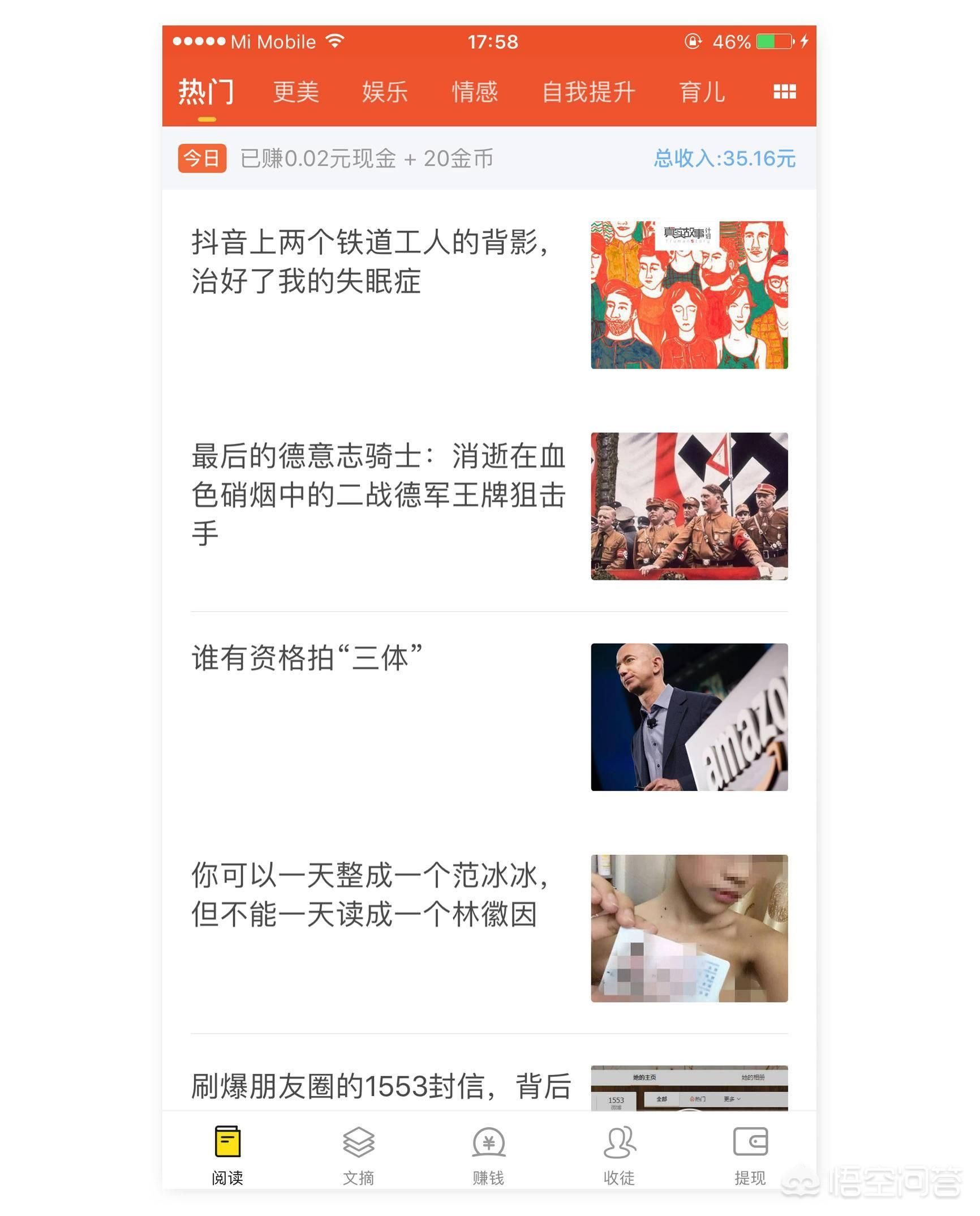 属于内容比较优质且具有一定实用价值的阅读类APP。目前阅读新闻赚钱的app很多,但大多数内容烂的实在看不下去。文摘头条我唯一每天都看的,都是用户收藏的好文章,看着容易上瘾啊!精神、钱包双丰收,何乐不为呢?