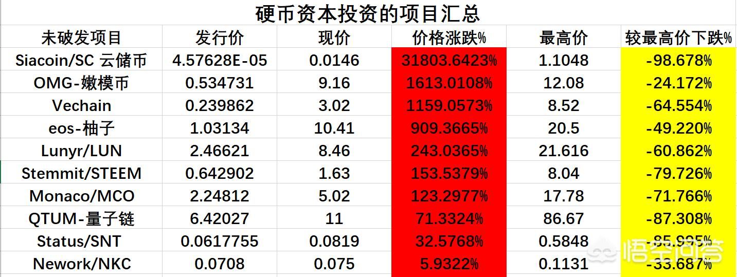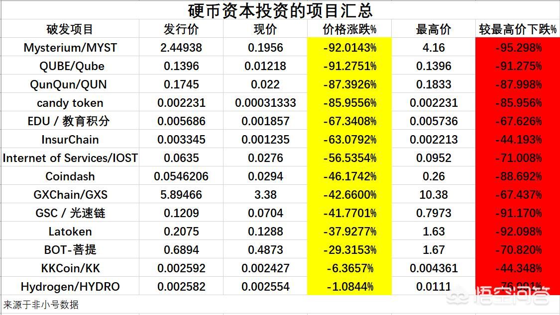 让我们看看比特币首富李笑来的投资史,李笑来的硬币资本从2013年以来一共投了37个项目,其中投资的币种现在还在交易所交易的有24个,破发的有14个,最失败的币MYST价格已经蒸发了92%,基本就没多少分钱了,成功的也有,云储币刚开始发行价格非常小,现在能到1分多一个也算是翻了3万多倍了。所以各位币友下次看笑来大佬再投什么项目,不要盲目跟大佬脚步,还是得三思而后行,毕竟破发率达58%呢。