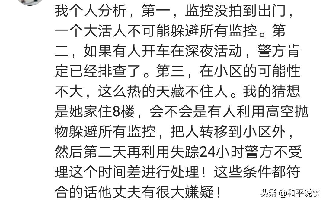 根据各种迹象,来女士的丈夫有很大的嫌疑。在7月5日到6日这两天的时间,他的行动范围在哪里,为何在7月6日晚才报警,如果有动机的话,这接近两天的时间应该是可以做很多的事情了。不知道警方有没查看来女士丈夫的监控录像以及手机通讯信息呢。