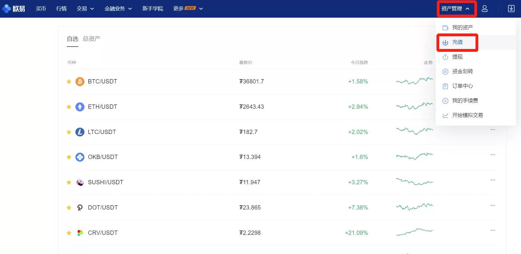 充值是指从钱包或者是其他平台的账户,把加密资产转至欧易OKX账户。当您需要将其他平台的资产充到欧易OKEX时,可按如下步骤进行充值。