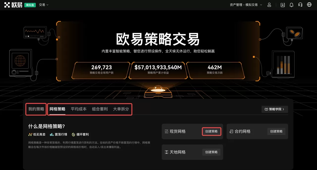 登录官网,点击【交易】-【策略交易】,进入策略广场。