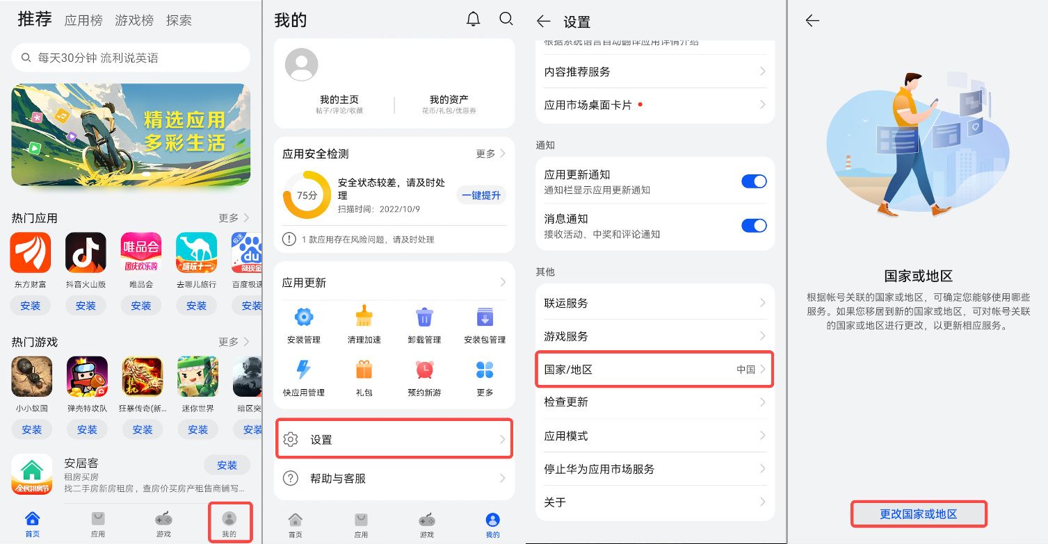 若纯净模式无法关闭,可在应用市场—【我的】—【设置】—【国家/地区】,更改国家或地区。