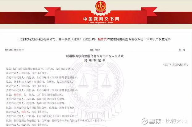 2017 年 7 月 27 日,比特大陆、算丰科技(北京)有限公司、杨作兴等侵害实用新型权纠纷一案在新疆乌鲁木齐市中级人民法院立案。其争议围绕一项名为“串联供电电路、虚拟数字币挖矿机和计算机服务器”的新型实用专利,由算丰科技公司以普通实施许可的方式许可北京比特大陆公司实施。立案之后,针对比特大陆主张的涉案专利,杨作兴向国家知识产权局专利复审委员会提出了无效宣告请求。