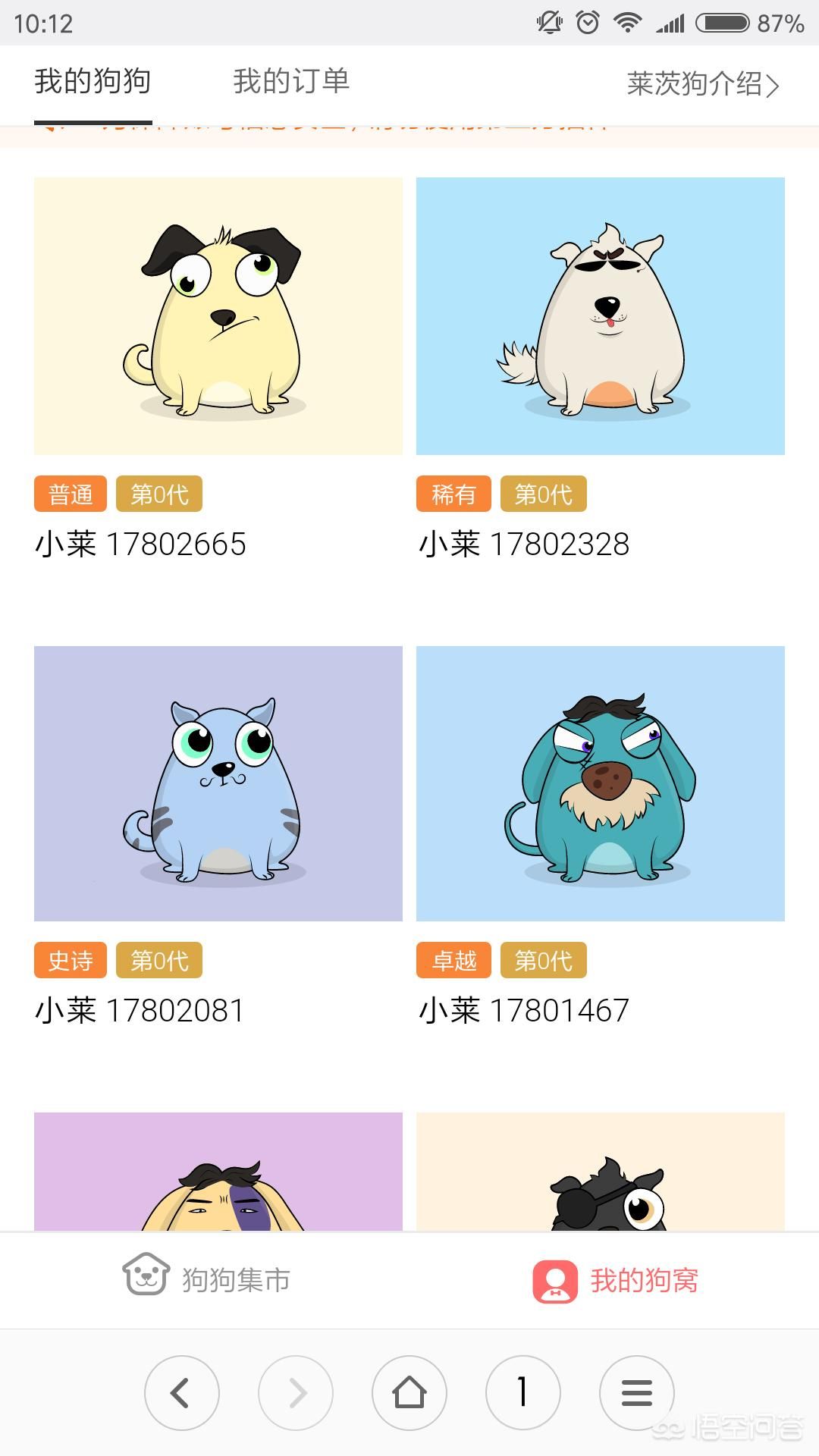 百度的区域链产品,狗狗有品级之分,传说、神话、史诗、卓越、稀有、普通等几个级别,目前都是0代,据说会有繁殖功能,一个人可以领至少7只,不过好像必须在百度钱包上做些认证。功能未知,目前只能用微分来回倒腾。