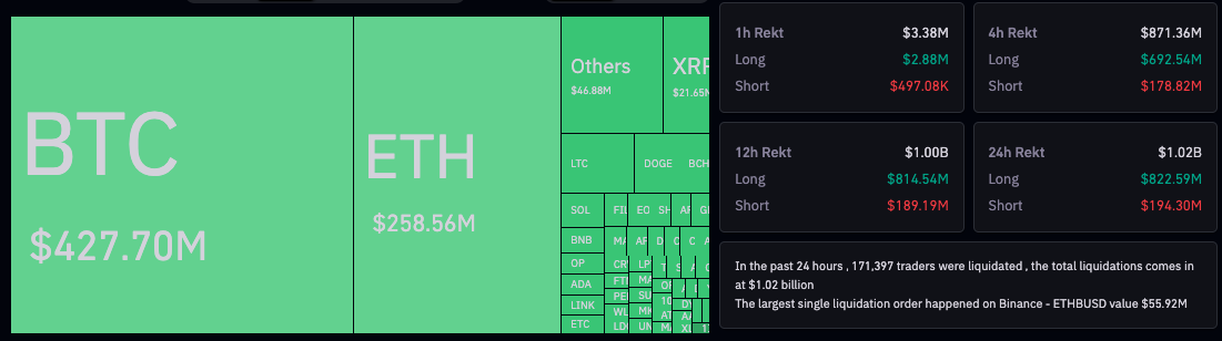 过去 24 小时内,价值超过 4.27 亿美元的比特币多头头寸已被清算。 来源:Coinglass