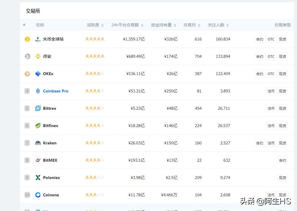 国内老牌的交易所有火币,OKEX,比特儿(gate,现在叫芝麻开门),还有后起之秀币安,币安是17年94事件后做起来的,一度做到国内第一,在世界上都是名列前茅的。现在国内三大交易所是:火币,OKEX,币安。