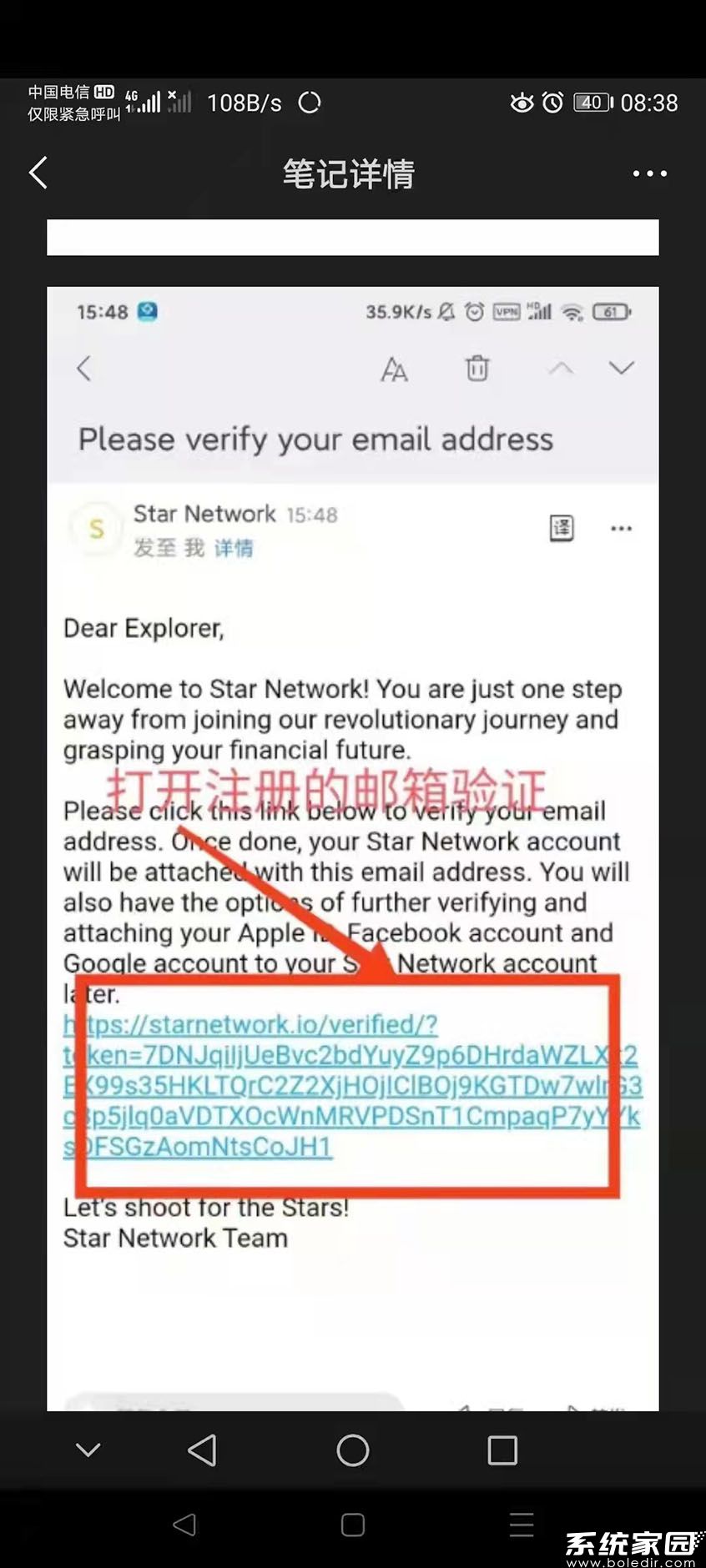 第六步、登陆电子邮箱、找到并打开 Star Network 星网 星币 发来的邮件、点击邮件中间位置的链接