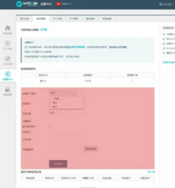 2. 设置完成后,点击上侧的导航栏内人民币提现或者比特币提现。从MYCOIN提现人民币选择收款帐户,输入提现金额,交易密码以及短信验证码方可提现。