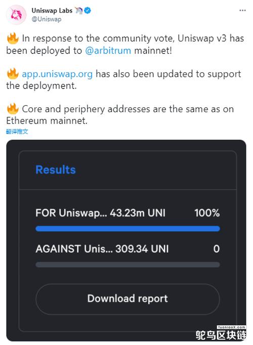 在Uniswap分享的图中也可见,社群治理投票以4,323万枚UNI支持、仅309UNI反对,获得压倒性通过。5月下旬该平台创办人Hayden Adams也表示已经开始准备Arbitrum部署,但强调并未放弃Optimism方案。