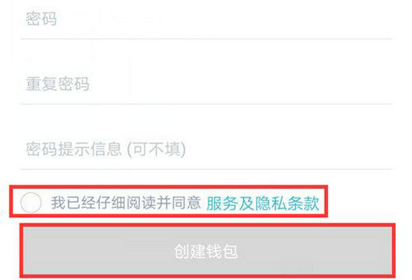 2、按提示依次填写相关信息,勾选阅读并同意条款选项,点击“创建钱包”。页面将提示进行备份钱包操作,点击“备份钱包”。