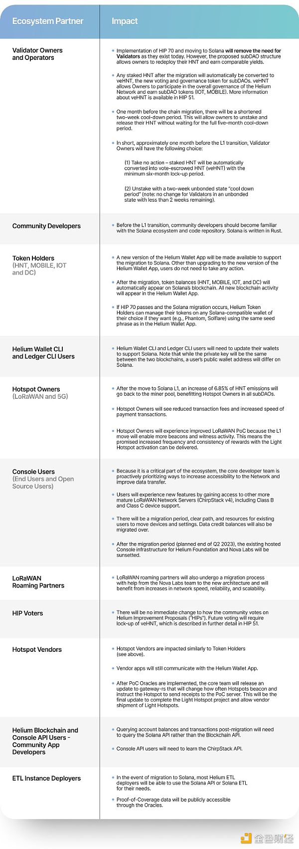 HIP 70中提案将会让Helium生态系统发生巨大变化,如果提案通过,势必讲给每个合作伙伴带来重大影响,尤其是验证者所有人和运营者,具体如下表所示:
