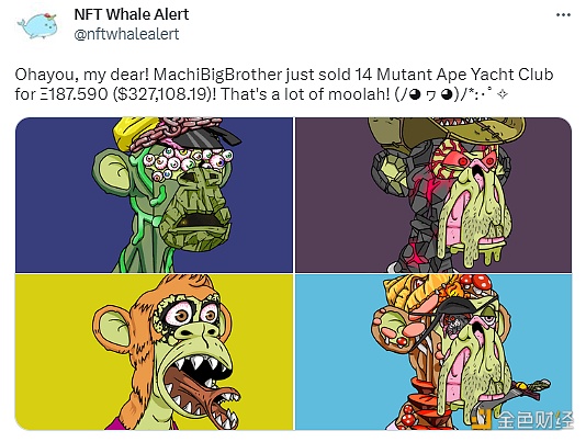 据NFT Whale Alert披露数据显示,“麻吉大哥”黄立成今日又抛售14枚“变异猿”MAYC获得187.59 ETH(约合327,108.19美元)、以及41个Otherside元宇宙虚拟地块Otherdeed获得65 ETH(约合113,000美元),当前MAYC地板价已跌至13.39 ETH,过去24小时降幅近5%,Otherdeed地板价同样出现下跌,目前为1.66 ETH。