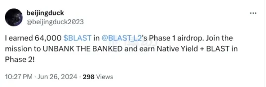 从 Twitter 运营上看,@beijingduck2023 似乎是一个为 blast 积分开创的新号,其本人并未发表过多关于 blast 的看法,而其他获得 BLAST 的大户就显得没那么冷静了。