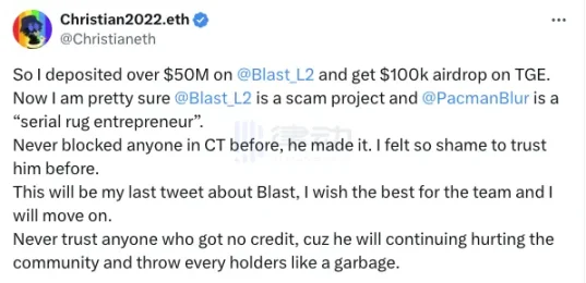 但 BLAST 的空投无疑让小散户和工作室乐都开了花,甚至将 blast 创始人 Pacman 称为「天才」,似乎这次「大的真的来了」,然而在一片欢呼声中,blast 的大户却被背刺了。