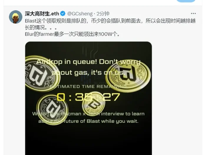 不仅如此,Blur 前五投标人 @GCsheng 还表示,Blast 的领取规则是排队的,币少的会插队到前面去,所以会出现时间越排越长的情况。而 Blur 的 farmer 最多一次只能领出来 100W 个。