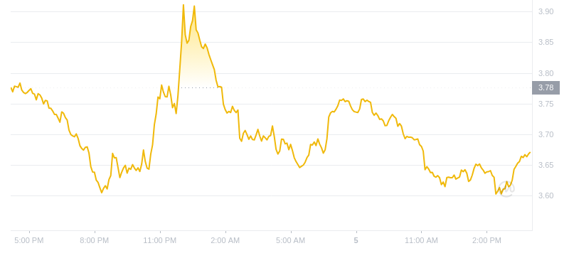 截至 2024 年 9 月 5 日 16 时,THORChain (RUNE) 的价格为 3.67 美元。过去 24 小时,交易量为 9228 万美元,价格下跌 2.9%。