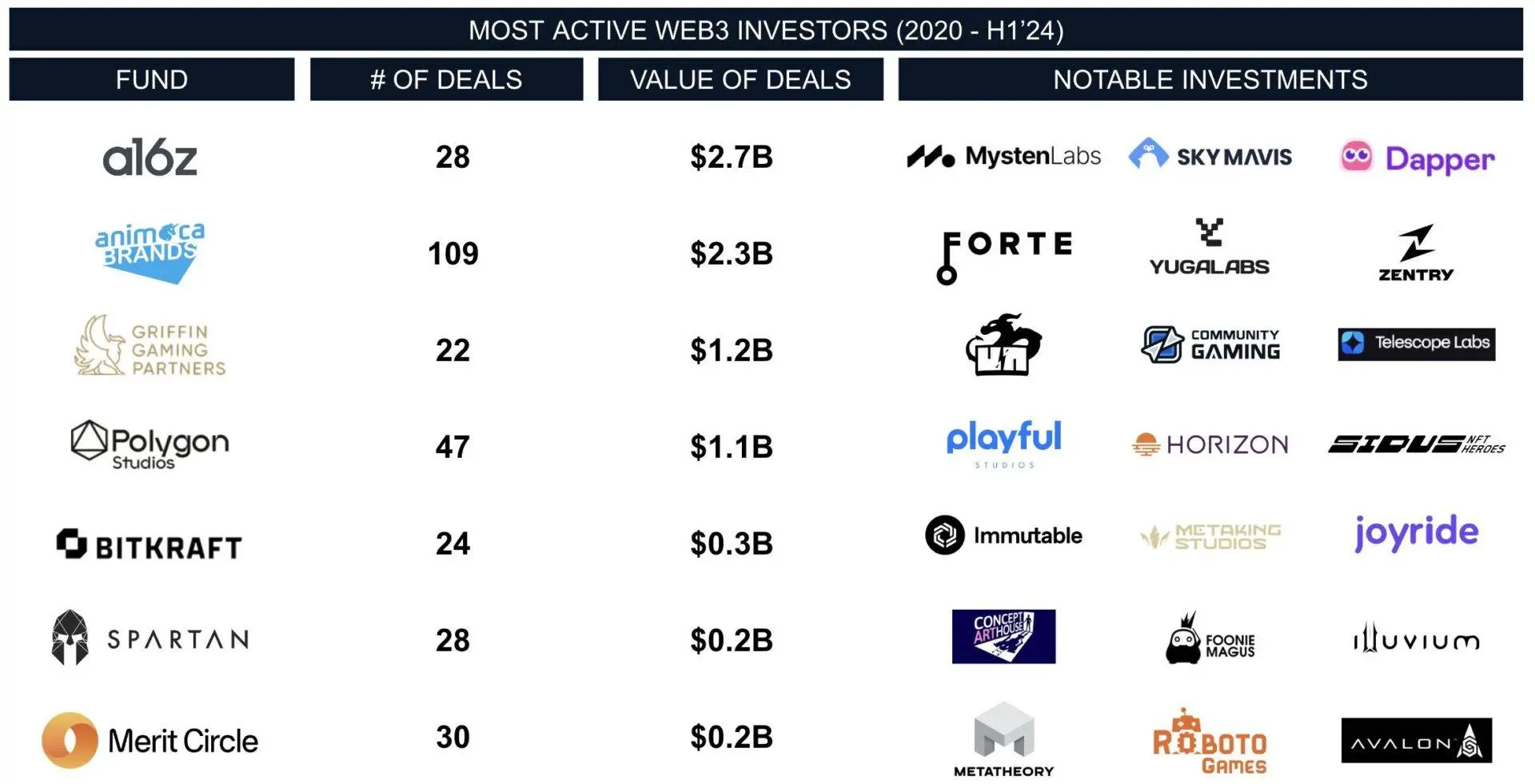在此期间,一些最受关注的风投主导的投资包括 Forte、Sorare、Yugalabs 和 Mysten Labs。这四家初创公司共吸引了近 24 亿美元,占 2020 至 2024 年迄今为止加密游戏总投资额的近 30%。