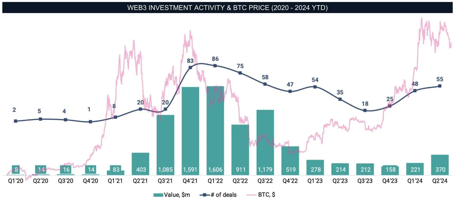 到 2023 年,交易活动依然疲软,并在第三季度跌至最低点,这与比特币初现复苏迹象的时间相吻合。值得注意的是,投资活动的增长与比特币价格的波动并不完全同步。尽管新一轮牛市已经开始,比特币在 2024 年上半年超越了此前的高点,但加密游戏领域的投资活动尚未恢复到之前的水平。这部分原因在于许多项目关闭,以及 Web3 游戏的发展仍处于起步阶段,尚在探索其客户群体和业务模式。