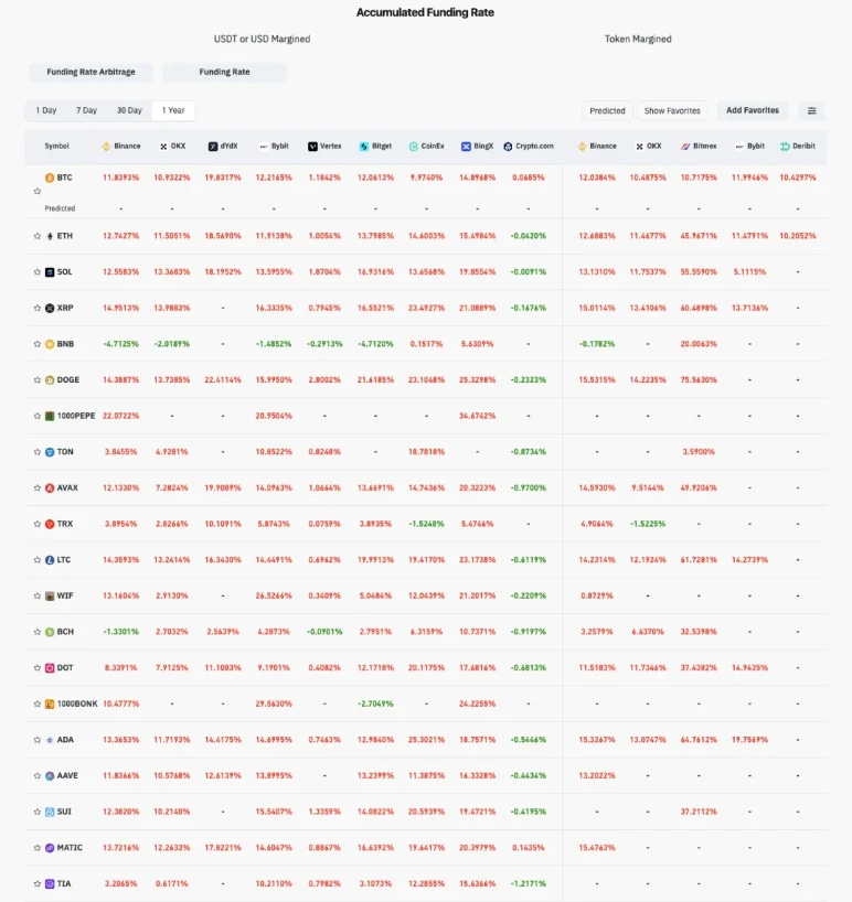 图 4:大多数代币的 1 年期资金费率为正,来源:Coinglass