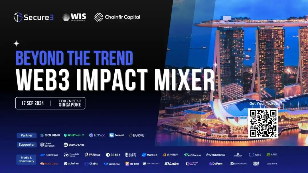 9 月 17 日,TOKEN2049 主会场前夜,Secure3 与 WIS、Chainfir Capital 联合主办 Web3 Impact Mixer,由 ChainCatcher 和 BUDAO Labs 协办,Solana、Trust Wallet、IoTeX、Burve Protocol 等项目团队将齐聚一堂,探讨下一个生态爆点。