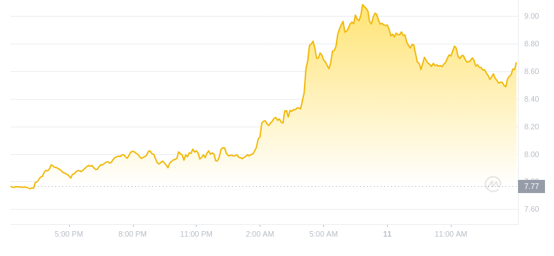 Internet Computer (ICP) 在过去 24 小时内飙升 11.56% 至 8.67 美元。
