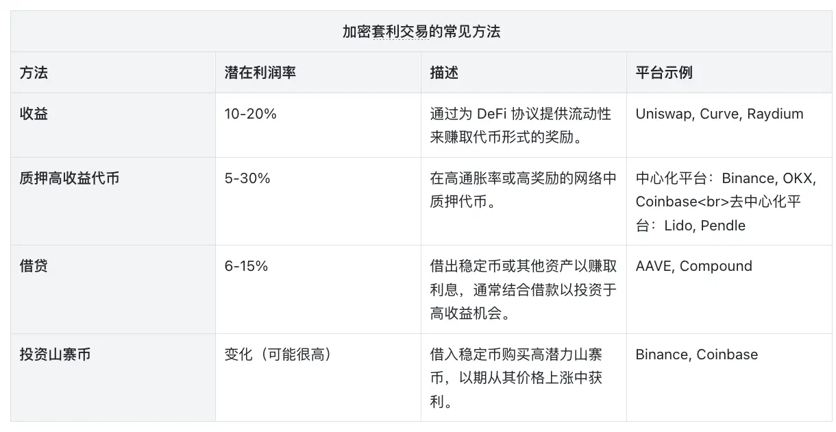 在资产方面,传统套利交易主要集中在受监管市场的货币对上,通常提供稳定的回报和中等风险。相比之下,加密货币套利策略利用更多样的平台,提供更大的灵活性和更高的潜在收益,但风险也显著增加。杠杆、收益农场和质押奖励的使用增加了加密货币套利交易的复杂性,使其成为一种有利可图但风险较高的投资策略。