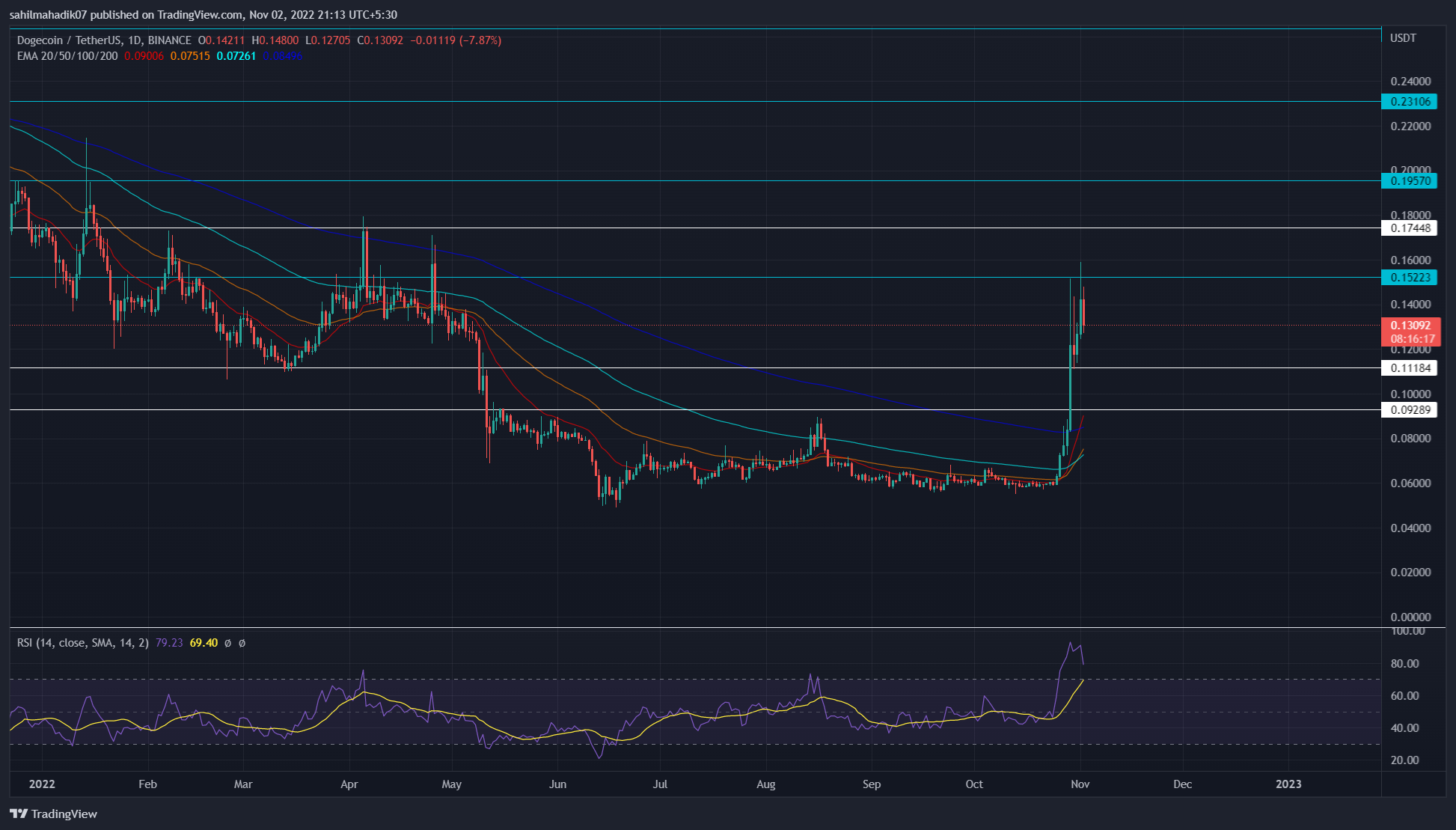 如果每日蜡烛收于0.1335美元支撑位下方,则预计山寨币将进行更长时间的修正。这种潜在的回撤有利于狗狗币的价格,因为它见证了几起事件的快速反弹。因此,0.11 美元和 0.09 美元的支撑位适合恢复当前的复苏。