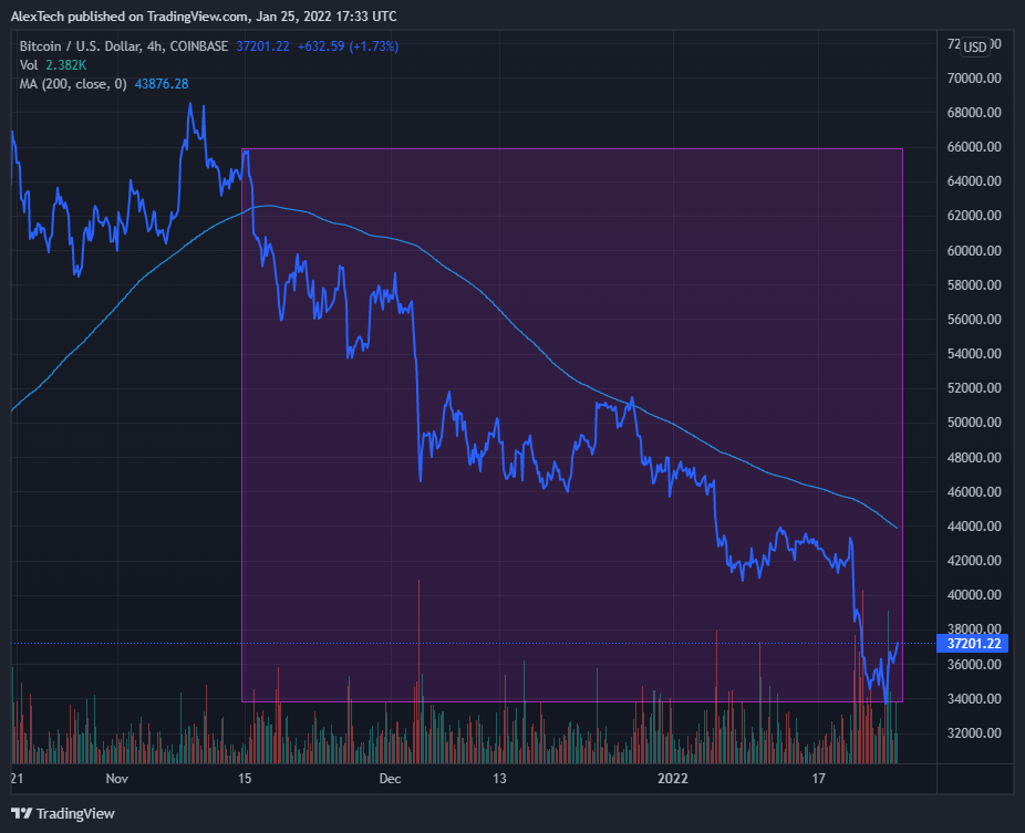 2021-2022 年的加密货币熊市是最近的熊市。BTC 从 2021 年 11 月 18 日的历史高位 (ATH) 68,721 美元跌至 2022 年 1 月 22 日的 34,000 美元左右,跌幅达 45%。