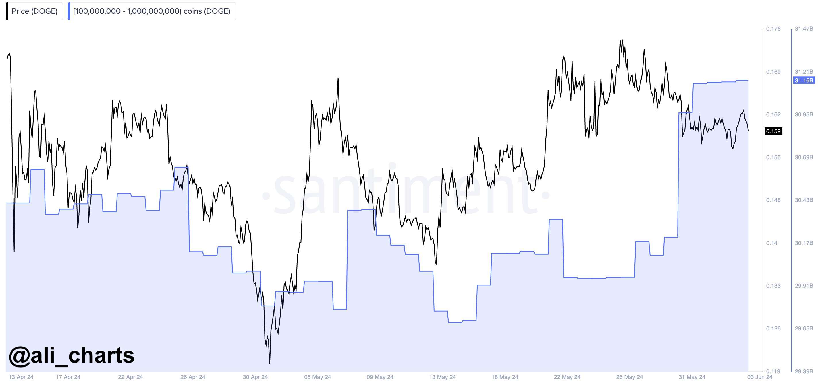 加密货币市场分析师 Ali Martinez 在最近的一篇文章中表示,狗狗币鲸鱼一直在疯狂购买。最近的报告显示,自 5 月 30 日以来,狗狗币鲸鱼在过去几天内已经积累了高达 2 亿的狗狗币。