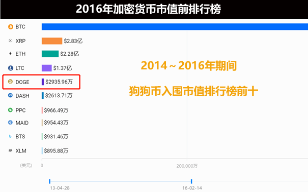 狗狗币自2013年诞生后,14~16年3年期间,其市值曾经多次入围加密货币市值排行榜前十,最高排名第五!