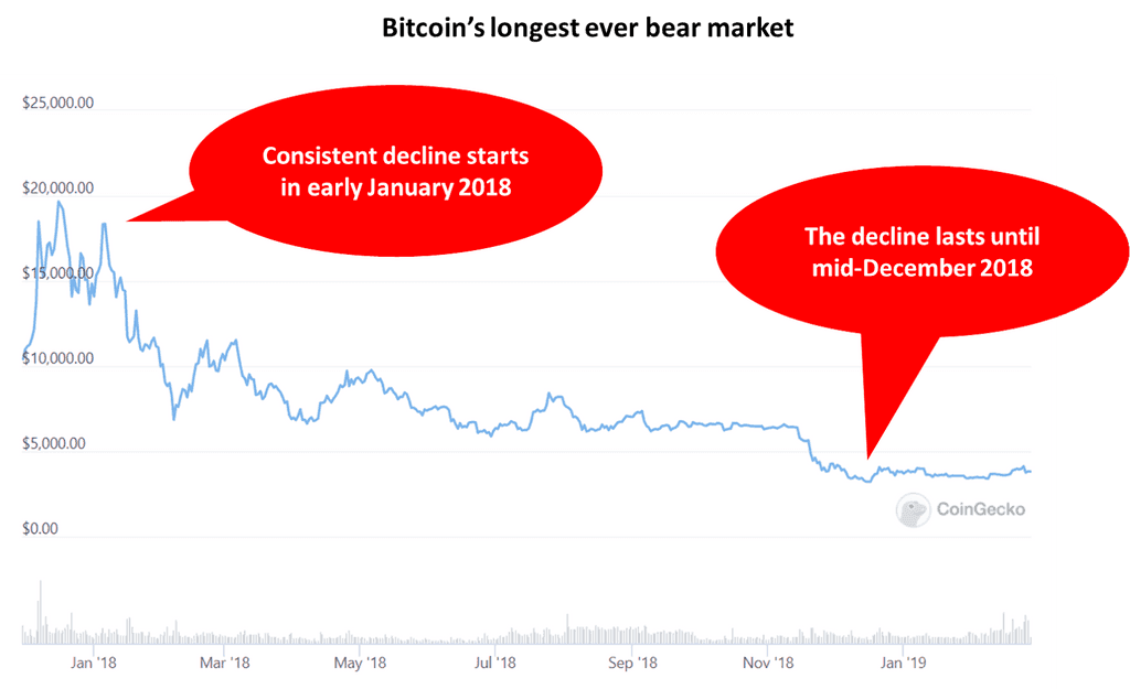 从2018年1月初到12月中旬,熊市导致比特币的价值从高点下跌了82%。这一熊市仍然是比特币持续时间最长的下跌,一些人称之为“2018年的加密货币寒冬”。