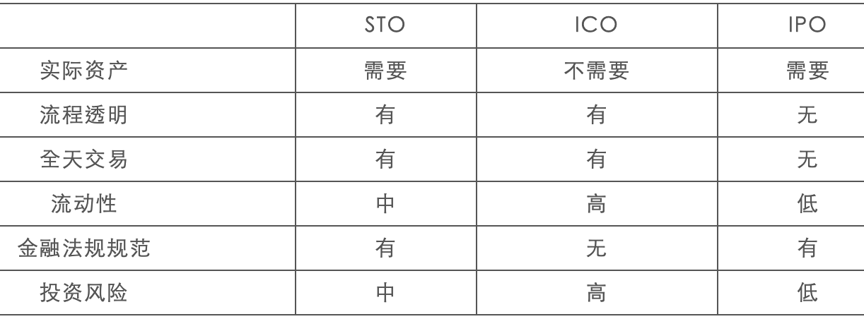 在这里我们将前述提到的ICO 和IPO 做说明,并整理了STO 与两者的比较,为什么STO 能改善ICO 与IPO 的不足之处?来看看STO 做了哪些改良: