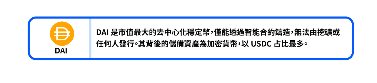 加密货币稳定币背后储备为加密货币资产,而非法定货币或债券等。由于加密货币的价格波动大,所以大多数的加密货币稳定币会使用「超额抵押」来支撑其价值,通常需抵押1.5 ~ 2 倍的加密货币资产才能铸造价值1 美元的DAI。