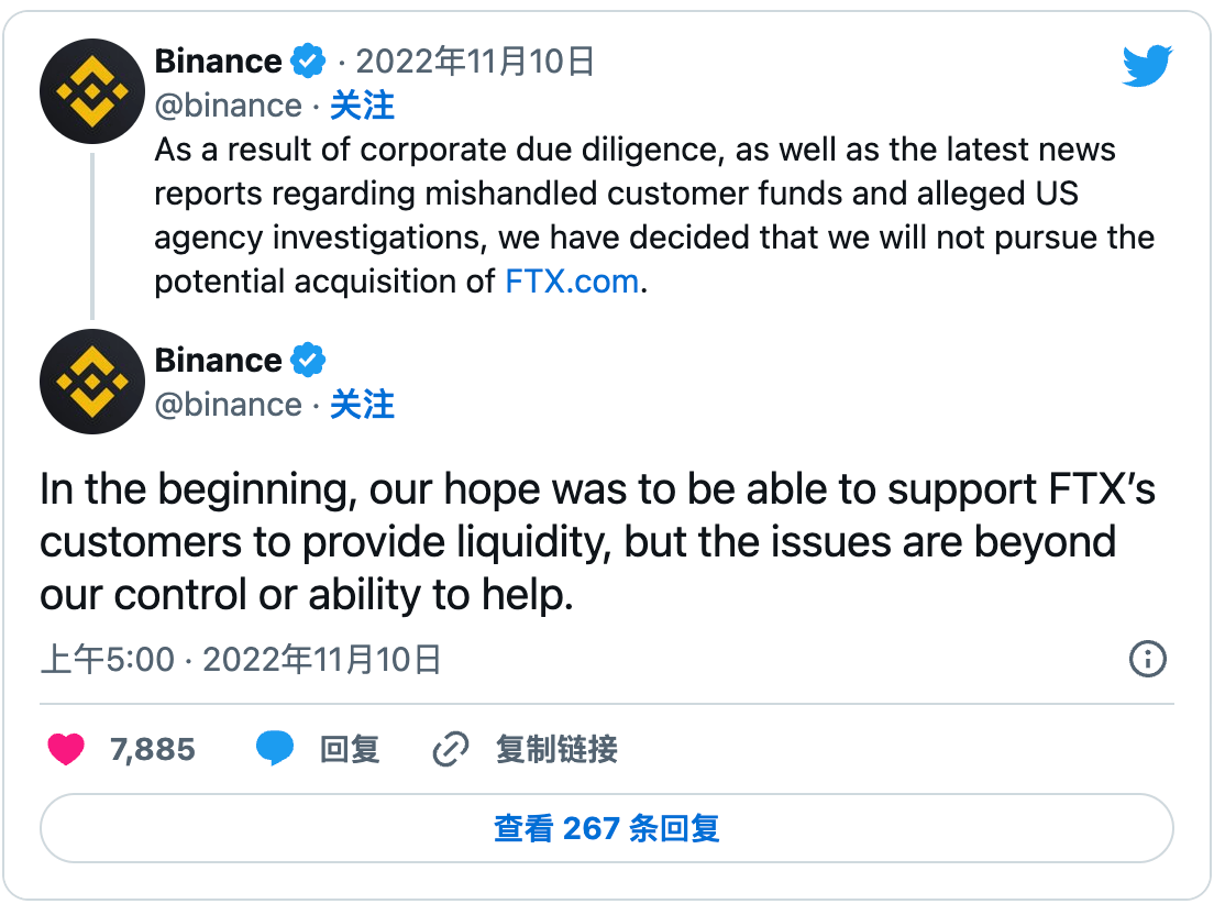 在此之后,币安团队对负债累累的 FTX 交易所的内部运作进行了尽职调查,以及有关用户资金管理不善的新闻报道,以及据称由美国当局进行的调查。