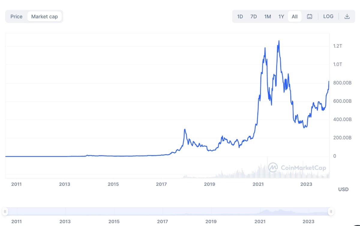 2008 年 10 月,中本聪(或化名的人)发表了现在著名的白皮书《比特币:点对点电子现金系统》,为革命性的数字货币奠定了基础。比特币是一种 2008 年之前不存在的货币,目前的市值约为 800 美元 B(截至 23 年 12 月 12 日)。自 2017 年底以来,比特币 (BTC) 的价值在过去 15 年中出现了明显的波动。