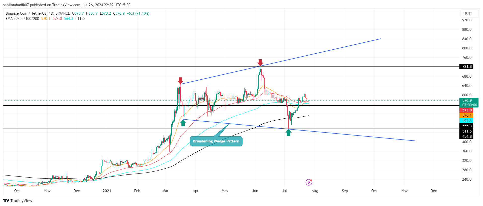 价格上涨收复每日EMA(20、50、100 和 200),凸显了市场情绪的积极转变。BNB 代币目前的交易价格为 578 美元,市值为 844 亿美元。