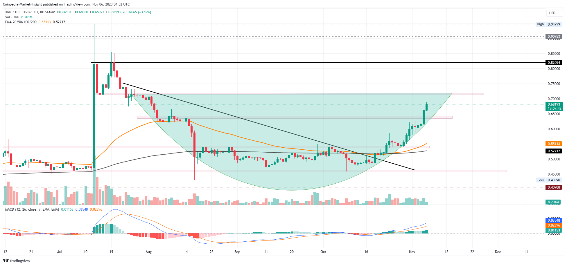 最近的价格走势显示出长期圆底模式的可能性,年初至今增长了 98%。此外,随着山寨币季节即将到来,XRP 价格可能很快就会升至关键阻力位之上,而 Ripple 可能会达到 1 美元大关。