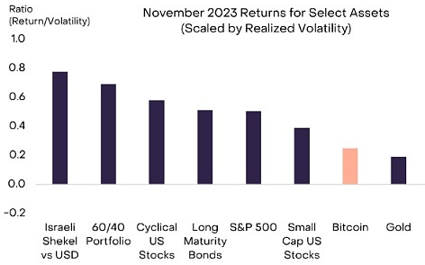 上个月,金融市场似乎对各种尾部风险有所放松,这有助于此前表现不佳的资产反弹。 例如,中东冲突的积极迹象似乎减少了对更广泛的地区混乱的担忧,与以色列经济相关的资产因此出现反弹(图表1)。 同样,在财政部宣布借贷需求增幅小于预期后,长期国债价格上涨(收益率下降)。 消费者价格通胀也继续下降,增加了人们对美联储最终降息和美国经济潜在“软着陆”的希望。 经波动率调整后,比特币本月表现不佳(自 8 月底以来表现出色),但仍实现了 9% 的涨幅(以太坊在 11 月上涨了 13%)。