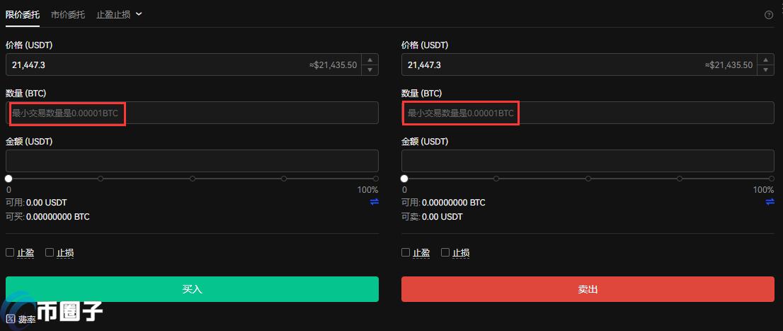 6.填写购买数量,点击买入,若是卖出,填写卖出数量,点击卖出即可。注意最少买入数量为0.00001 BTC。