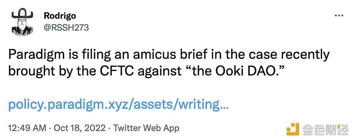 10月18日消息,据Paradigm法律负责人Rodrigo在社交媒体透露,Paradigm已提交法庭顾问简报声援Ooki DAO。Rodrigo表示,Paradigm虽然不是本案的当事方,但认为有必要公开反对美国商品期货交易委员会(CFTC)对毫无戒心的技术用户过度执法并削弱DAO在美国运营的能力。CFTC正试图通过赢得针对虚构被告的诉讼来扩大其权力,从根本上说是不公平的。