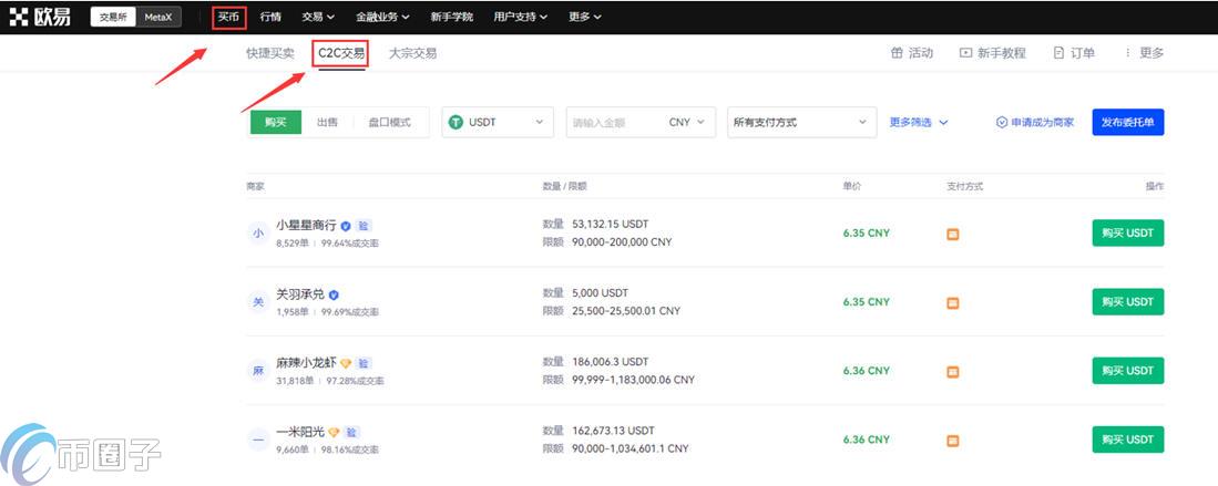 4.欧易交易所的法币交易在首页交易的板块中,我们点击交易之后,就能够看到法币交易的区域。法币交易包含快捷买币、C2C交易、大宗交易三个板块,点击页面中的【买币】,选择【C2C交易】