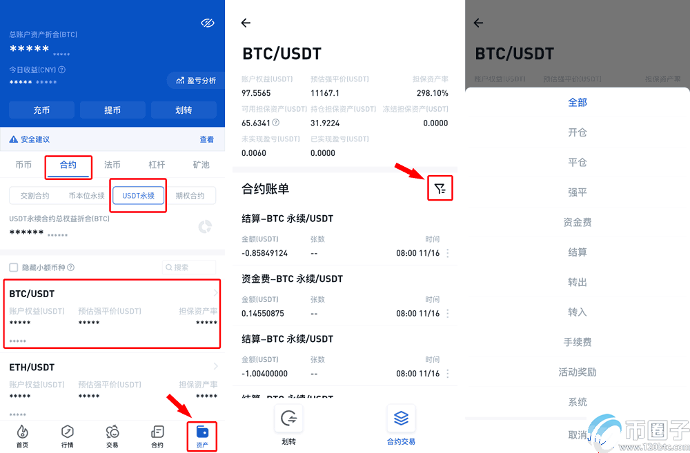 9. 点击右下角“火必资产”,选择“永续合约账户”和合约品种,即可查看相应合约品种的合约账单。