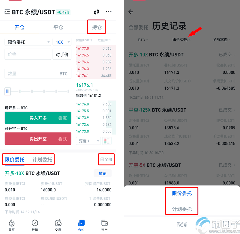 选择倍数后,可使用“限价委托”或“计划委托”开仓,看涨则选择“买入开多”,看跌选择“卖出开空”。