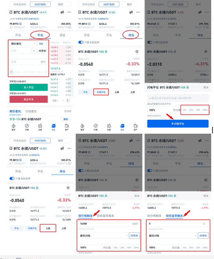 切换为持仓界面,选择“闪电平仓”或使用“止盈止损”进行下单。